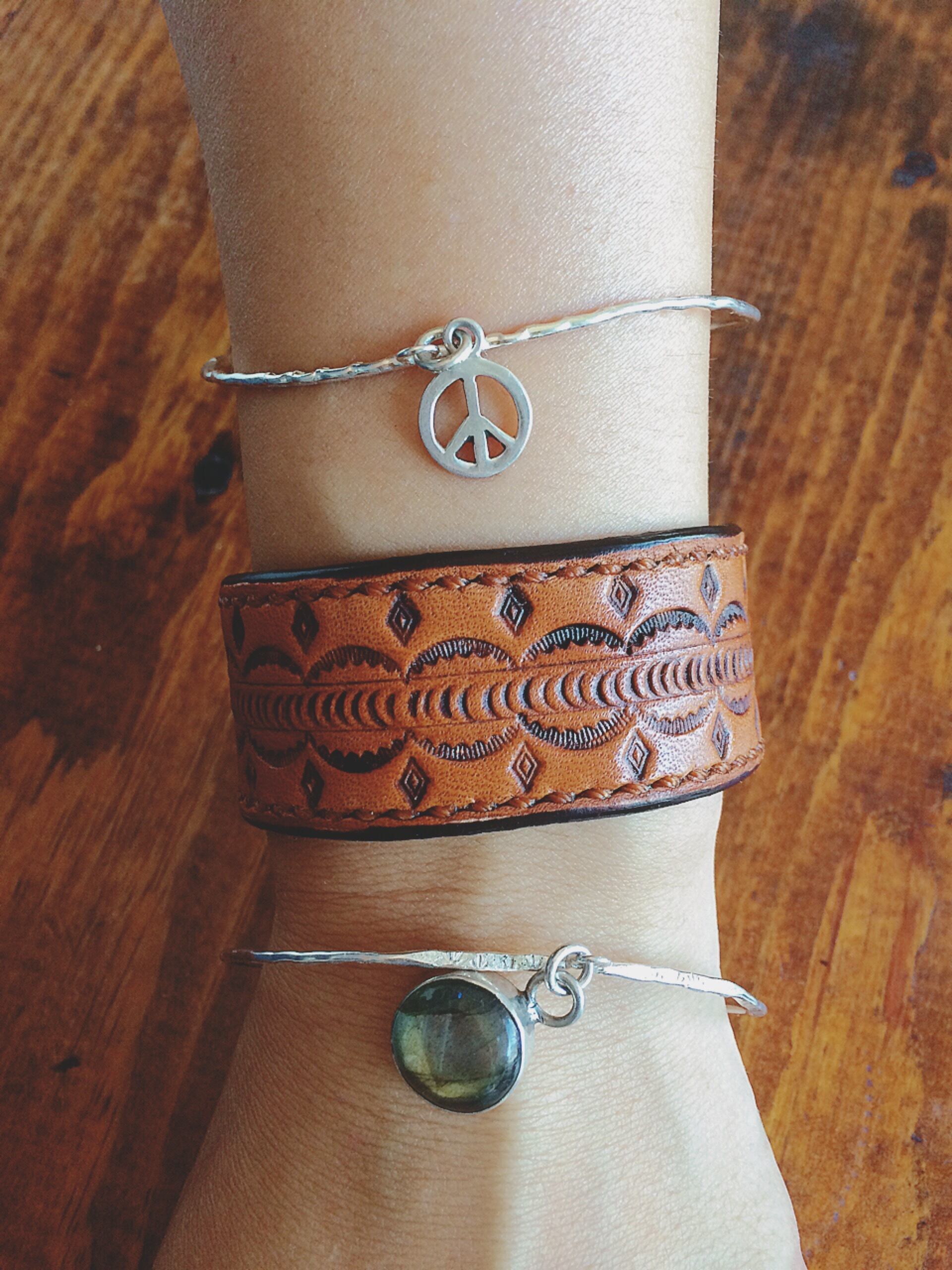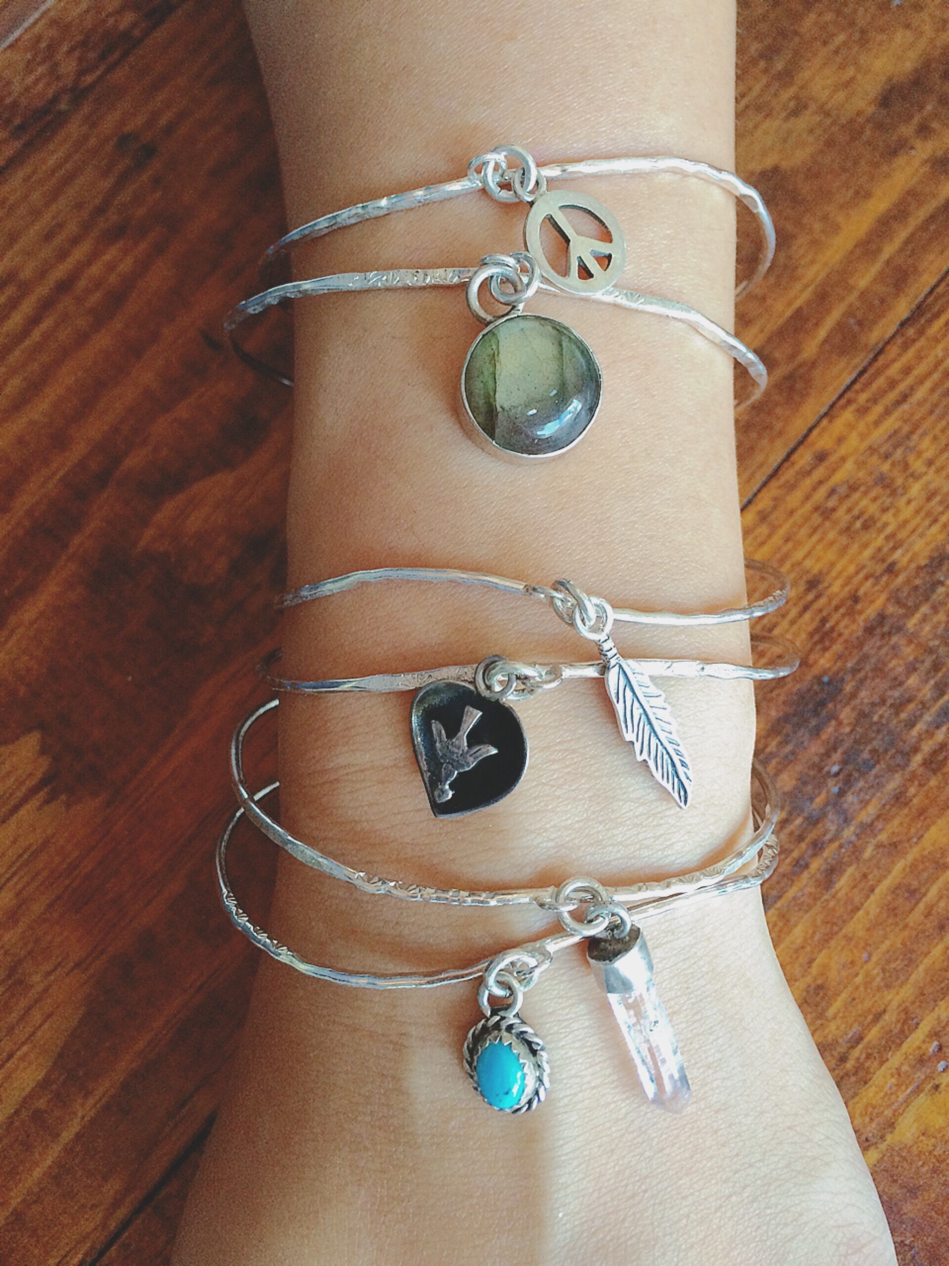 シルバー925の細い輪っかにラブラドライトのチャームが付いたブレスです