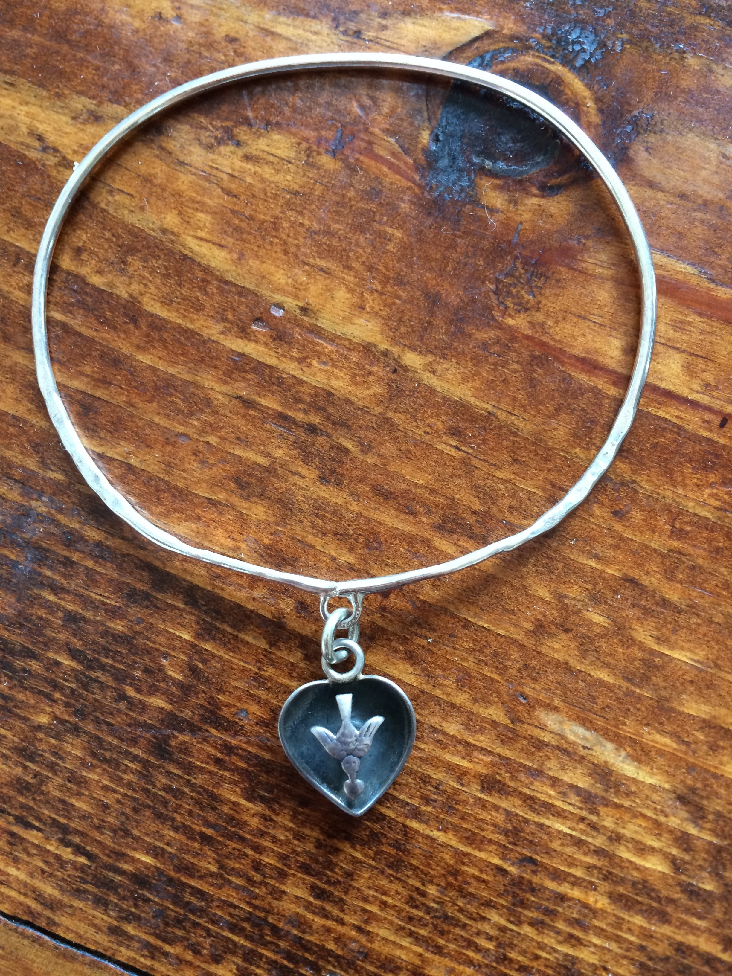 シルバー925の細い輪っかにハチドリが浮き出たハートのチャームが付いたブレスです